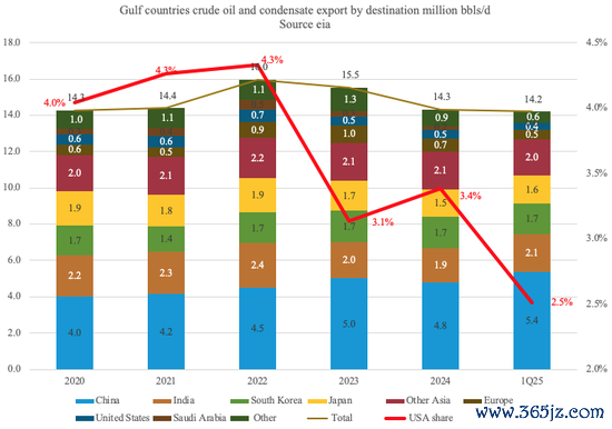 (海湾出口原油及凝析油主要目的地 百万桶/日)