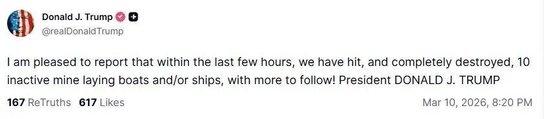 面对伊朗的布雷行动,美方反应激烈却略显混乱。美国总统特朗普连续发出强硬威胁,3月 9日警告伊朗若阻断石油运输将遭 “二十倍猛烈打击”,3月10日进一步要求伊朗立即移除水雷,否则面临 “前所未有的军事后果”,并宣称美军已摧毁10艘伊朗布雷舰艇。美军中央司令部随后证实,已在海峡附近摧毁包括16艘布雷艇在内的多艘伊朗海军船只,并发布相关打击视频。