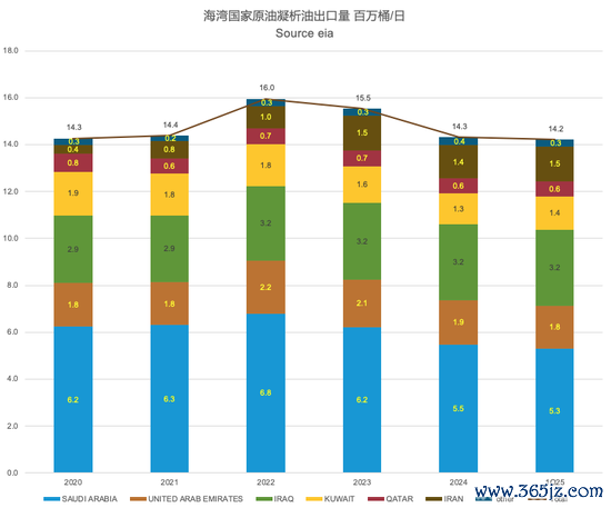 (海湾国家原油凝析油出口量 百万桶/日)